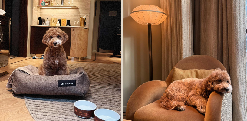 Dog-friendly hotel amenities at The Newman London including branded dog bowl and cosy bed